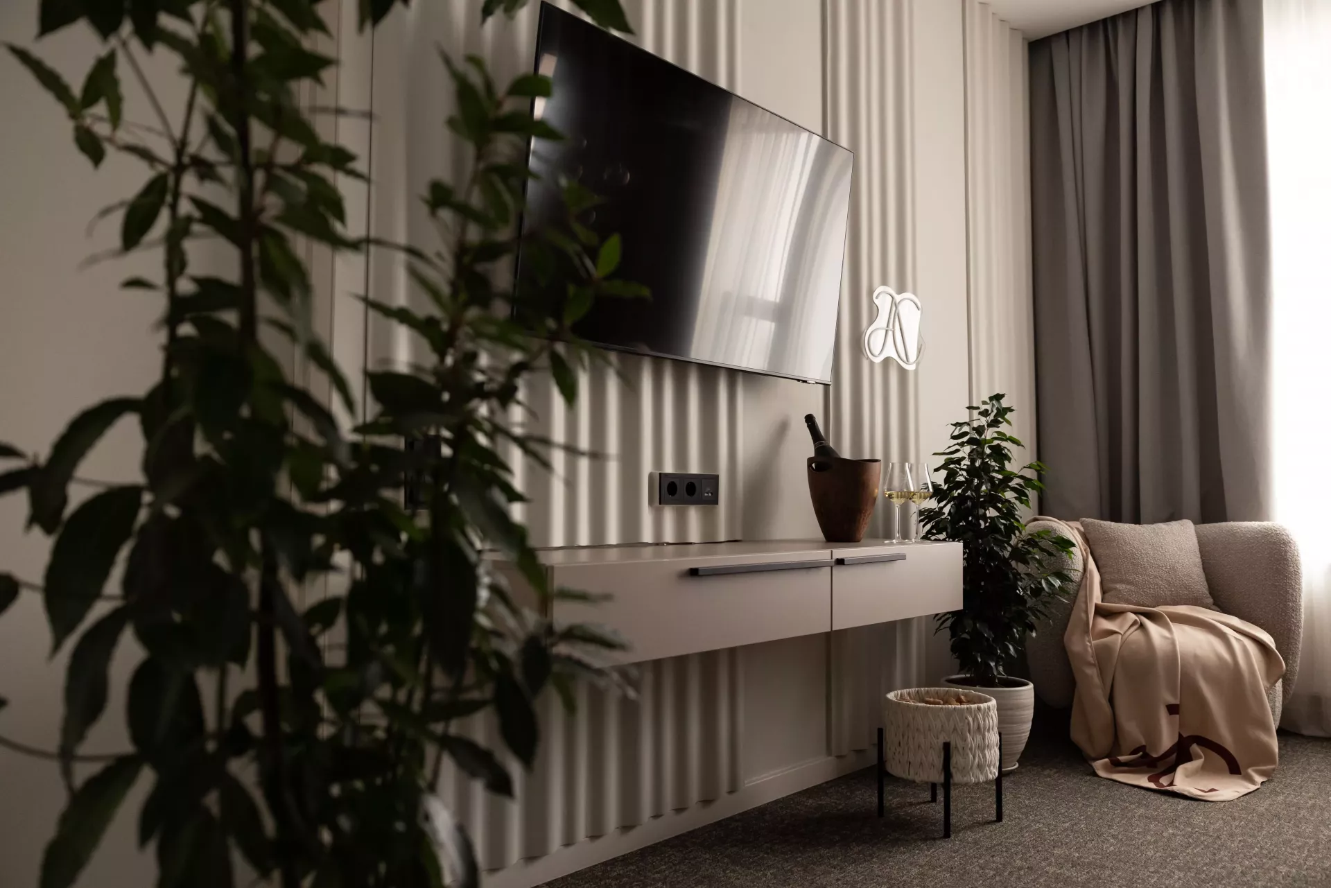 Вас встретит уютный интерьер, вдохновленный живописными пейзажами винодельни Абрау-Дюрсо, выполненными в ручную омским художником. Теплые тона, натуральные материалы и стильные элементы декора создают атмосферу гармонии и уюта. Просторный двухкомнатный номер категории «Люкс» с видом на реку с широкой кроватью King Size и уютной гостиной, оборудованной комфортным диваном, прекрасно подойдет, как для романтического отдыха так и для ценителей комфорта премиум-класса в бизнес-путешествиях.